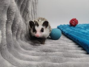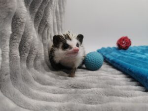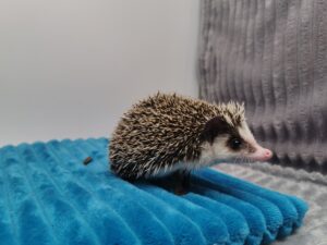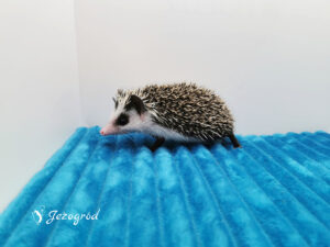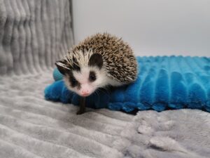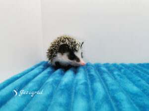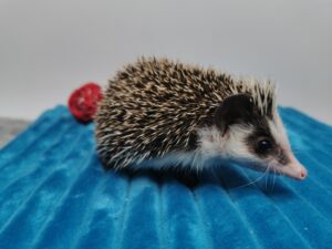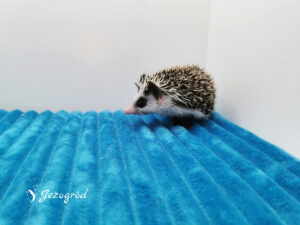 mam na imię Gerda i jestem młodą samiczką jeża pigmejskiego. Wyrosłam w towarzystwie braci – Granata, Gringo i Grincha – więc od pierwszych dni uczyłam się odwagi i ciekawości świata. Moja unikalna maska na pyszczku sprawia, że wyglądam jak mała bohaterka z baśni – środek przez nos cały biały, a ciemne plamy na policzkach dodają mi charakteru. Pół grzywki białe, pół ciemne – niby zwykły jeż pigmejski, a jednak taki wyjątkowy! Uwielbiam poznawać świat, węszyć w każdym kącie terrarium i przytulać się do człowieka, który daje smakołyki i ciepło rąk.