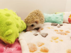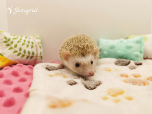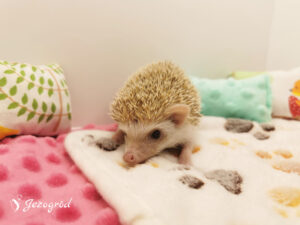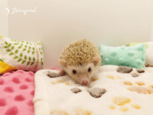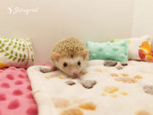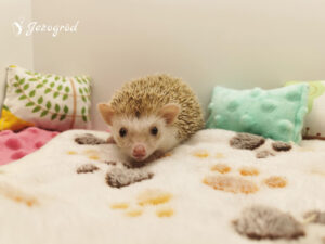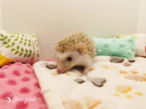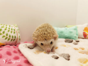 Jeżynka przyszła na świat w naszej hodowli, w miocie W2. Jest wyjątkowo spokojnym jeżykiem, preferującym relaks nad bieganiem po kołowrotku. Często trzeba ją zachęcać do aktywności – najlepiej reaguje na zabawki, które motywują ją do poruszania się i eksploracji. Jedzenie traktuje raczej jako dodatek i zjada tyle, ile musi. Poranki często zastają miskę z zapasem jedzenia, a jeżynka nie zabiega o więcej. W terrarium lubi porządek, co jest dla niej równie ważne jak chwile odpoczynku.